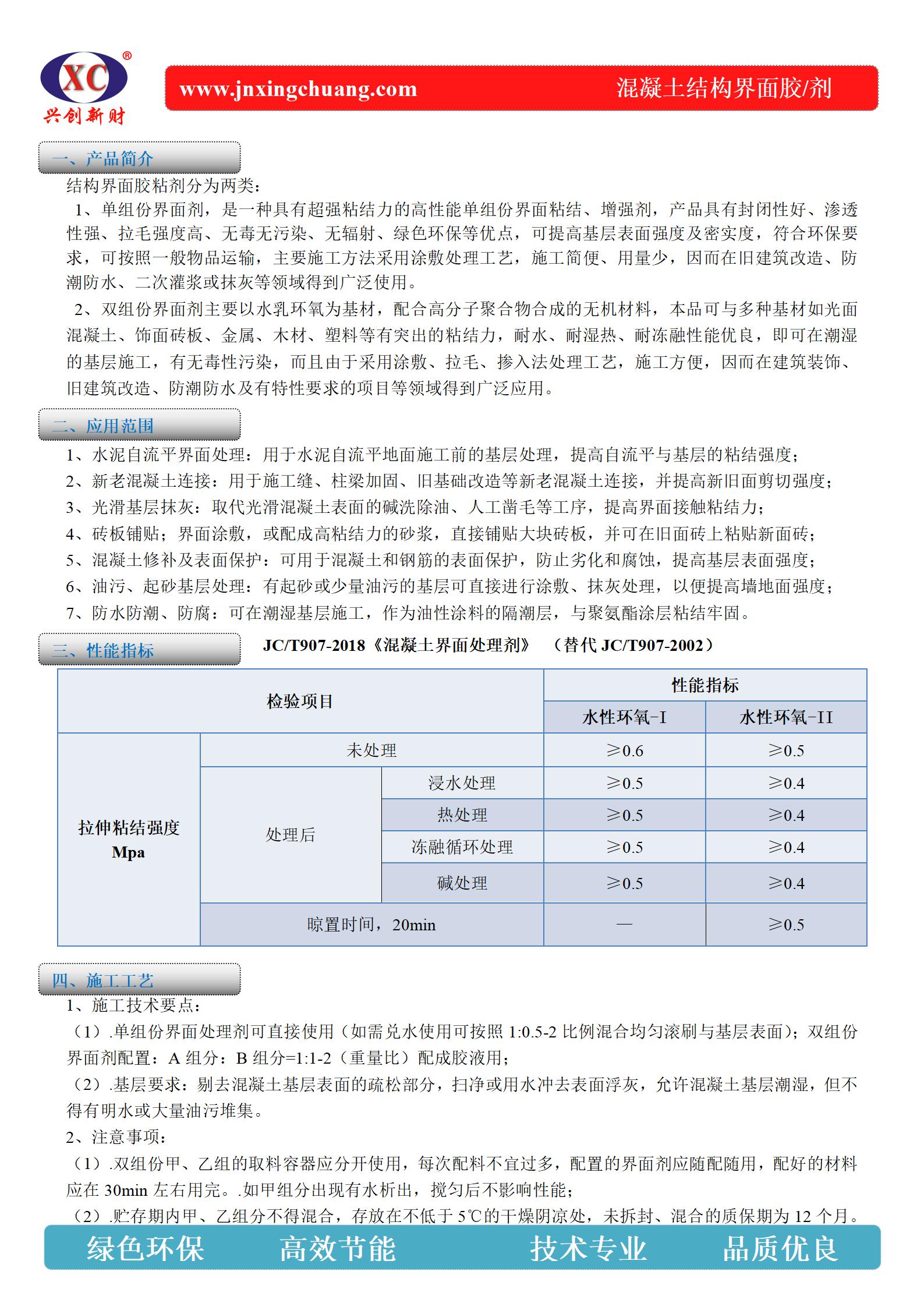 結構界面膠粘劑分為兩類:1、單組份界面劑,是一種具有超強粘結力的高性能單組份界面粘結、增強劑,產品具有封閉性好、滲透性強、拉毛強度高、無毒無污染、無輻射、綠色環保等優點,可提高基層表面強度及密實度,符合環保要求,可按照一般物品運輸,主要施工方法采用涂敷處理工藝,施工簡便、用量少,因而在舊建筑改造、防 潮防水、二次灌漿或抹灰等領域得到廣泛使用。 2、雙組份界面劑主要以水乳環氧為基材,配合高分子聚合物合成的無機材料,本品可與多種基材如光面混凝土、飾面磚板、金屬、木材、塑料等有突出的粘結力,耐水、耐濕熱、耐凍融性能優良,即可在潮濕的基層施工,有無毒性污染,而且由于采用涂敷、拉毛、摻入法處理工藝,施工方便,因而在建筑裝飾、舊建筑改造、防潮防水及有特性要求的項目等領域得到廣泛